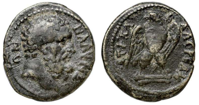 | BMC 34-37 | Blaundos, Lydia, AE17, semi -autonomous issue. 161-180. 3.88 gr. Magistrate Valerianos. BΛAYNΔEΩN, Bearded head of Herakles right / CTΡ KΛ BAΛEΡIAN, eagle standing front on two bones, head left, wings spread. BMC 34-37; SNG Cop 77; Waddington 4908; Paris 161; Plankenhorn 968; GRPC Lydia 65. | Text | Image |