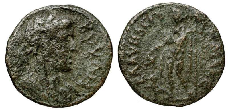 | Paris 156 | Blaundos, Lydia, AE17, Autonomous. Before 276. Draped bust of Dionysos right, wreathed with ivy / BΛA-YNΔE-ΩN, legend in three lines within laurel wreath. BMC 42; Waddington 4907; Paris 156; Walcher 2659; SNG Turkey 10, 487-488; GRPC Lydia 96.. | Text | Image |