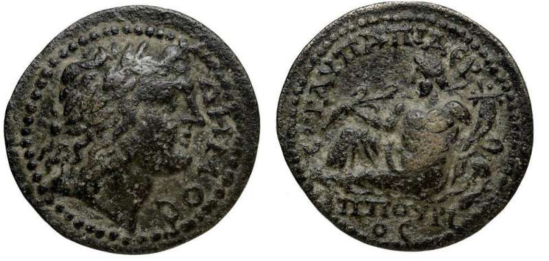 | RPC 1349 | Domitian, AE of Blaundos, Lydia. AE 2.35 gr. ΔOMITIANOC KAICAΡ, bare-headed, cuirassed bust right / BΛAOYNΔEΩN TI KΛAY ΦOINI, eagle with wreath in beak, standing left, wings spread, upright branch to left. RPC II 1349; Waddington 4919; Paris 185; SNG Cop 91; Leypold I, 921; GRPC Lydia 105. | Text | Image |