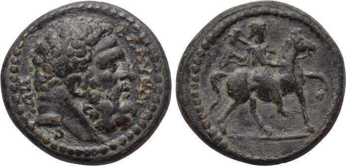 | Winsemann 2868 | Blaundos, Lydia, AE18, Autonomous issue. AD 138-192. 3.53 g. Bearded head of Herakles right / BΛAYNΔEΩN, Apollo-Mên on horseback right, holding bipennis over shoulder. Winsemann 2868; RPC Online 3001; GRPC Lydia 60. | Text | Image |
