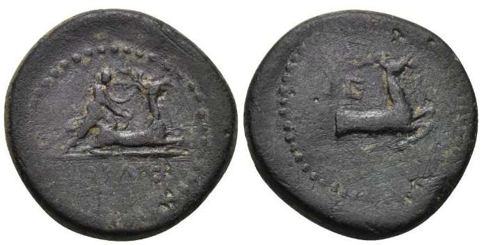 | RPC 2389 | Hierocaesarea, Lydia, AE19, semi-autonomous issue. AD 54-59. Magistrate Kapitonos. 3.43 g. IEΡOKAICAΡEΩN, head of Artemis right, quiver and bow behind shoulder / EΠI KAΠITΩNOC AΡCIEΡEΩC, forepart of stag recumbent right, IE in field above stag's back. BMC 2; RPC I 2389; Imhoof LS 8; Johnson Sardis 147; GRPC Lydia 12. | Text | Image |