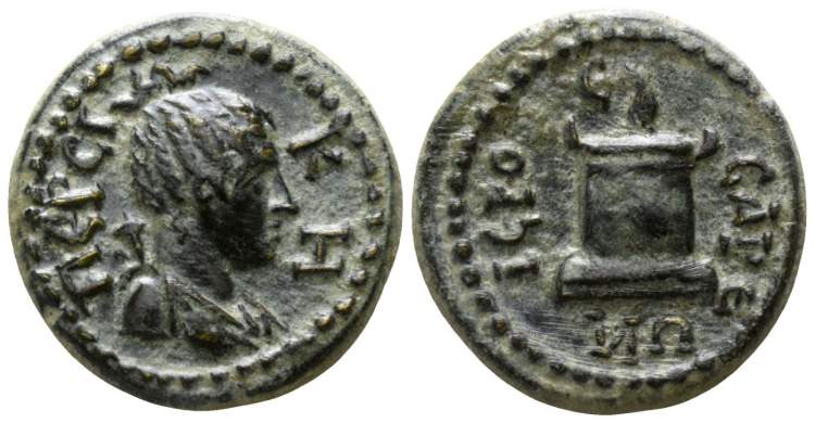 | RPC 2388 | Agrippina II, AE18 of Hierocaesarea, Lydia. 54-59. Magistrate Kapitonos. AΓΡIΠΠINAN ΘEAN ΣEBAΣTHN, draped bust right / EΠI KAΠITΩNOC IEΡOKAICAΡEΩN, Artemis standing right, placing arrow into her bow, stag standing right at her side. RPC I 2388; SNG von Aulock 2959; Paris 446-447; Waddington 5003; GRPC Lydia 72. | Text | Image |