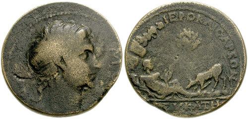 | RPC 2385 | Nero, AE19, of Hierocaesareia, Lydia. 5.20 gr. 54-68 AD. NEΡΩN KΛAYΔIOC KAICAΡ CEBACTOC, bare-headed, draped bust right / EΠI KAΠITΩNOC IEΡOKAICAΡEΩN, Artemis standing right, stringing a bow, quiver on her back, stag at her side. RPC 2385; Imhoof KM 1; Vienna 32023; Lindgren III 471; GRPC Lydia 67. | Text | Image |