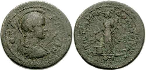 | Mionnet IV, 258 | Lucilla, AE19 of Hierocaesarea, Lydia, 164-169. ΛOYKIΛΛA CEBACTH, draped bust right / IEΡOKAICAΡEΩN, Artemis standing, holding bow in left hand and with her right reaching for an arrow from quiver at her shoulder. Paris 455; Mionnet IV, 258; SNG Munich 142; Winsemann 1043 corr. (empress and obv. legend); GRPC Lydia 95. | Text | Image |