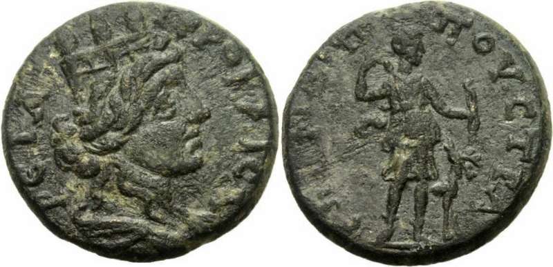 | Righetti Coll. 9482 | Septimius Severus. AE19 of Hierocaesareia, Lydia. 193-211. AYTO KAI Λ CEOYHΡOC (from top left), laureate head right / IEΡOKAICAΡEΩN, Tyche standing left, kalathos on head, holding rudder in right hand and cornucopiae in left. Righetti Coll. 9482; Duesseldorf 11416; GRPC Lydia 113. | Text | Image |
