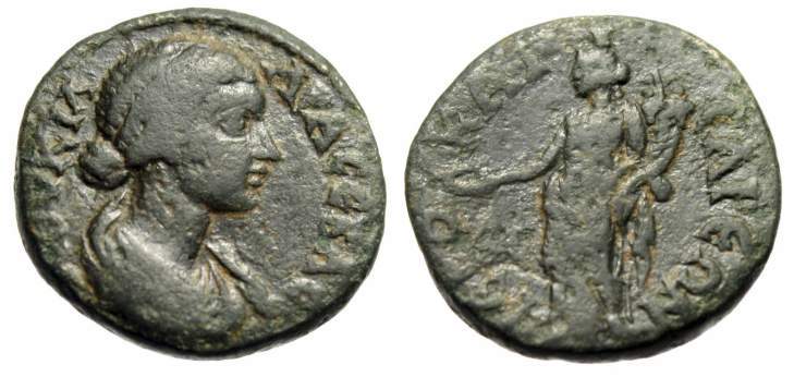 | GRPC Lydia 96 | Lucilla, AE18 of Hierocaesarea, Lydia. AD 164-169 AD. 5.25g. ΛOYKIΛΛA CEBAC, draped bust right / IEΡOKAICAΡEΩN, Homonoia or Tyche standing left, holding patera and cornucopiae. GRPC Lydia 96; Romae Aeternae 172183558181. | Text | Image |