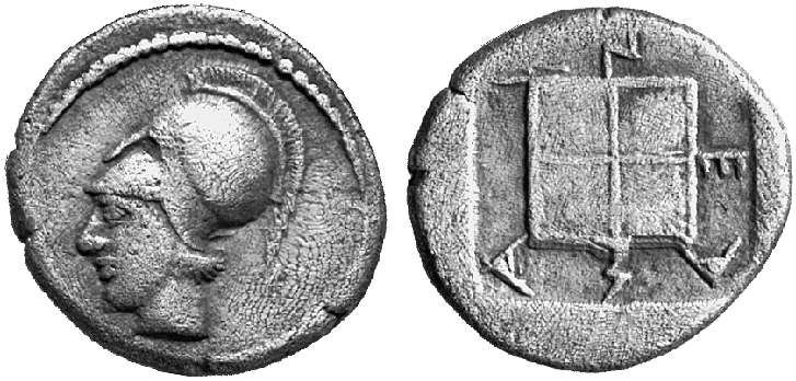 | SNG Cop 34 | Aeneia, Macedonia. AR Tetrobol, ca 450 BC. 2.32 g. Helmeted, lightly bearded head of Aeneias left / AI-N-E-AΣ around a lined square, all within incuse square. SNG Cop 34; SNG ANS 73. | Text | Image |