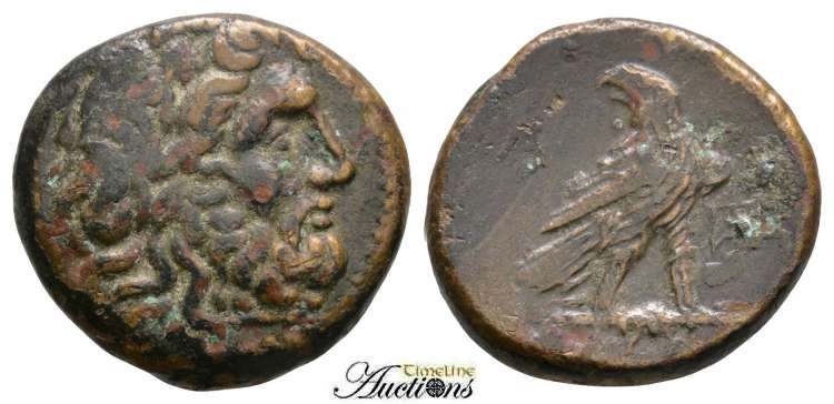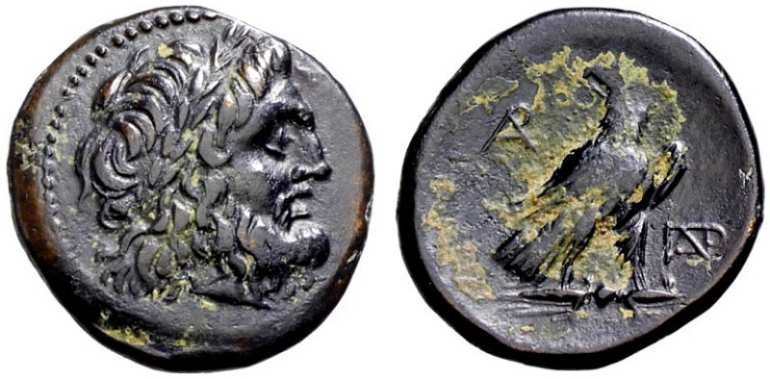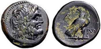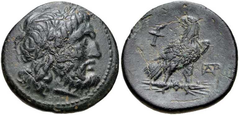 | BMC 64 | Paroreia, Macedonia, AE civic issue, 185-168 BC. 8.13 g. Laureate head of Zeus right. / Eagle standing right on thunderbolt, head left, wings closed, AΡ monogram in left field, ΠAΡ monogram in right field. BMC 64; AMNG III-2, 37 var (eagle's head right). | Text | Image |