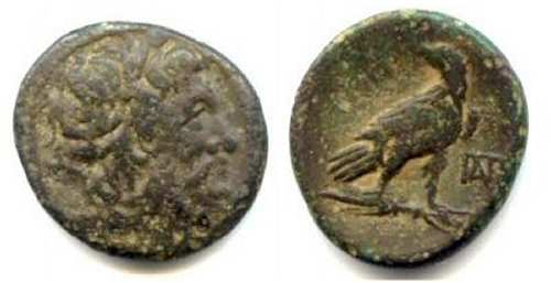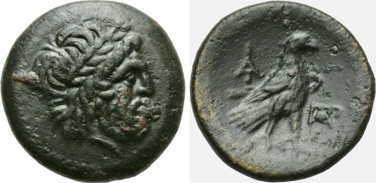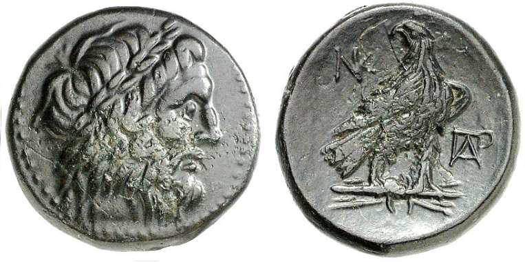 | SNG Cop 254cf | Paroreia, Macedonia, AE 19.9 mm, 7.36 g. Laureate head of Zeus right / Eagle standing right, head left, ΠAΡ monogram in right field. | Text | Image |