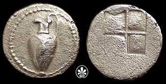 | Dewing 1078 | Terone, Macedonia. Ca 490-480 BC. AR Tetradrachm. 17.1 gr 29.5 mm. Amphora with ivy leaf and grape bunch hanging from each handle, grape bunch hanging from pearled base of neck / Quadripartite incuse square. BMC 1; Hardwick pl. 29, 5; Dewing 1078. | Text | Image |