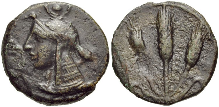 | Mueller 284 | Iol, Mauretania. AE15, Late 3rd-2nd century BC. 2.56 g. Head of Isis left, wearing crown of Isis with crescent and moon. Punic letters before head. / Three corn-ears. Mueller Afrique 284; SNG Cop 684; MAA 147. | Text | Image |