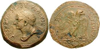 | Mueller 111 | Ptolemy, King of Mauretania. AE36. AD 24-40. Dated year 17 (AD 39-40). REX IVBA REGIS IVBAE F, diademed draped bust of Juba II left / R PTOL A XVII, eagle standing right on thunderbolt, wings spread. MAA 360, Mazard 389. | Text | Image |