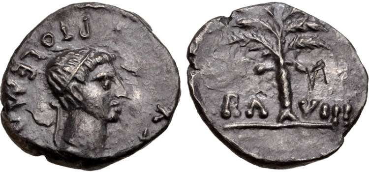 | Mazard 428 | Kingdom of Mauretania, Ptolemy, AR denarius, 16 mm, 2.09 g. struck 23-40 AD. REX PTOLEMAEVS, Diademed head of Ptolemy right. / RA VIII, palm tree. Mazard 428; MAA 284; Mueller 183. | Text | Image |