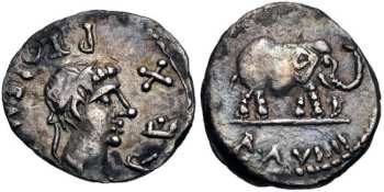 | Mazard 404 | Kingdom of Mauretania, Ptolemy, AR denarius, 15 mm, 1.71 g. struck 23-40 AD. REX PTOLEMAEVS, Diademed head of Ptolemy right. / Elephant walking right, a serpent below, R A VIIII in exergue. Mazard 404. | Text | Image |