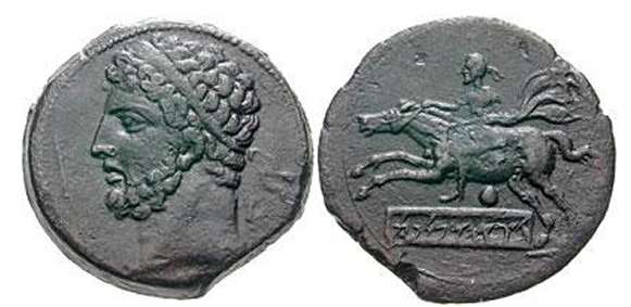 | SNG Cop 492 | Syphax, King of Mauretania, Ca 213-202 BC. AE26mm (10.04 g). Diademed and bearded head left / Horseman galloping left; dot and Punic legend "sphq hmmlkt" in cartouche below. Mazard 10; SNG Copenhagen 492. | Text | Image |