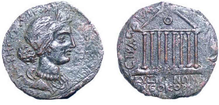 | Mionnet II, 141 | Kyzikos, Mysia, AE25, AD 253-268. Magistrate Apollonidos. 8.45 g. KYZIKOC, head of Kyzikos right, hair bound in a taenia. / CTΡA-AΠOΛΩ-NIΔOY K-YZIKHN-ΩN ΔIC N-EOKOΡ-ΩN, legend in seven lines within wreath. Mionnet II, 141 (citing Sestini num vet Ainslie 7 (CTΡA overlooked). | Text |  |