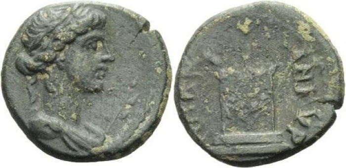 | SNGvA 3431 | Plotina, AE of Ankyra, Phrygia. 4.28 g. ΠΛΩTEINA ΣEBAΣTH, draped bust right / (from top right) ANKYΡANΩN, cult statue of Artemis Ephesia standing facing, between two stags. SNG von Aulock 3431. | Text | Image |