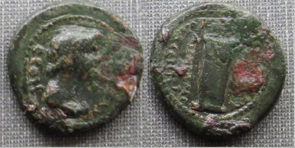 | RPC 3113b | Ankyra, Phrygia. semi-autonomous, AE17. Time of Nero, magistrate Bassilaos, 62-63 AD. ΘEON CYNKΛHTON, draped bust of Senate right / ΠO OYOΛCENNA ANKYΡANΩN, AITHCAME BACCIΛA in fields, Stele. RPC 3113b; BMC 2; SNG von Aulock 3421. | Text | Image |
