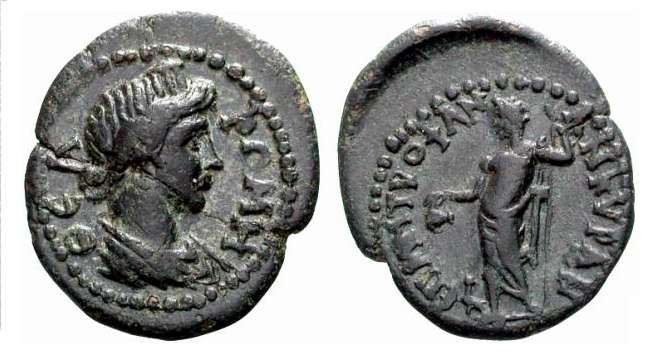 | RPC 3111 | Nero and Poppaea, AE25 of Ankyra, Galatia. AD 62-63. 10.39 g. Magistrates Volasenna and Ti. Bassilaos. NEΡΩN KAIΣAΡ ΣEBAΣTOΣ ΠOΠΠAIA ΣEBAΣTH, laureate head of Nero right, facing draped bust of Poppaea left / OYOΛAΣENNA ANΘYΠATΩ IOYΛIEΩN ANKYΡANΩN AITHΣAMENOY TI BAΣΣIΛAOY EΦ, Zeus or Poseidon standing left, holding anchor and sceptre. RPC I 3111.3 (this coin); Paris 329. | Text | Image |