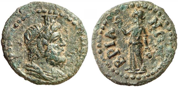 | BMC 1 | Bria, Phrygia. AE20. Semi-autonomous issue, AD 193-235. 3.46 g. Draped bust of Serapis right, polos on head. / BΡIANΩN, Isis standing left, holding sistrum and situla. BMC 1; Aulock Phrygien 1 225-240; Weber 7040; Bunbury 326; Waddington 5751; SNG von Aulock 3520; Mionnet IV, 300; SNG Cop 224; SNG Munich 163; | Text | Image |