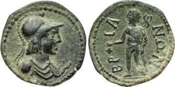 | Imhoof GRM 1 | Bria, Phrygia. AE19, semi-autonomous issue. AD 193-235. 3.67 g. Helmeted and cuirassed bust of Athena right, wearing aegis. / BΡIANΩN, Hermes, naked, standing left, holding purse and caduceus. Imhoof GRM 1; Prowe III 1652; Von Aulock, Phrygien I, 223-224. | Text | Image |