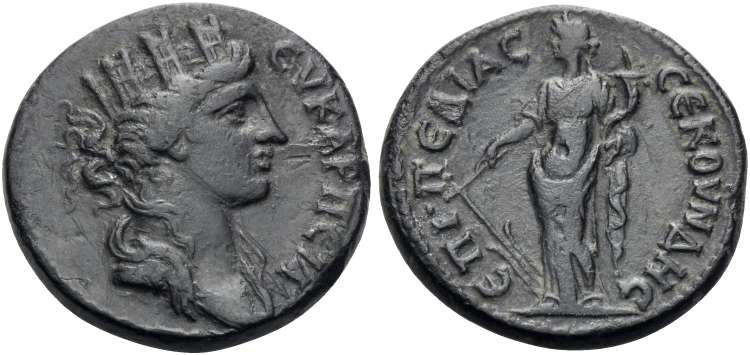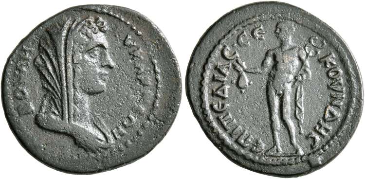 | RPC 3160 | Livia, AE of Eukarpeia, Phrygia. after 14 AD. 2.76 g. ΣEBAΣTH, draped bust right / EYKAΡ ΠITIKOY AΠΦIA IEΡHA in four lines within lined border, all within dotted border. RPC 3160; BMC 14. | Text | Image |