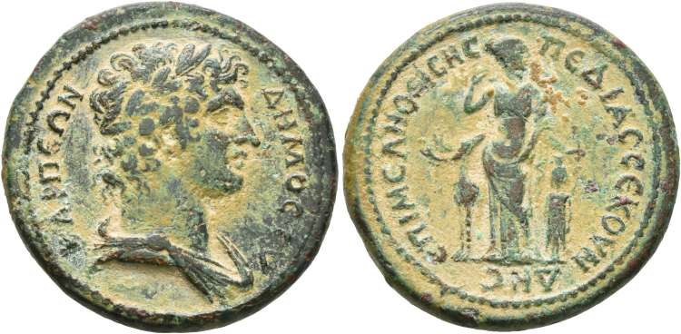 | BMC 2 | Eucarpeia, Phrygia. AE25, semi-autonomous issue, 9.99 g. AD 117-138. Issued by Pedias Secundus. ΔHMOC EYKAΡΠEΩN, laureate, draped bust of Demos right. / EΠIMEΛHΘEICHC ΠEΔIAC CEKOYNΔHC, Artemis standing front, looking right, holding bow and reaching for an arrow from the quiver at her shoulder, stag standing left behind her, small figure of Kybele standing front at her side. BMC 2; Mionnet 4, 545; Paris 1043b; Waddington 5989; RPC III 2590. | Text | Image |
