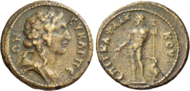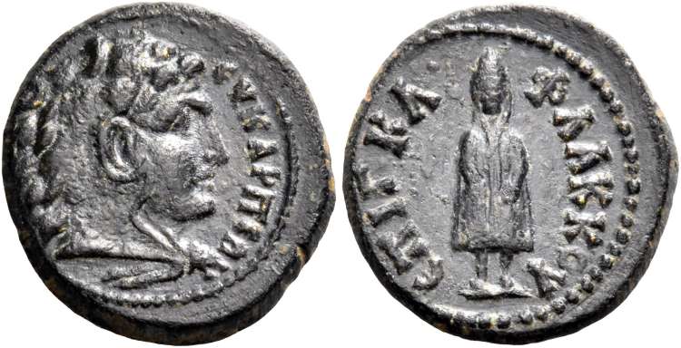 | SNG vA 3576 | Eucarpeia, Phrygia. AE16, semi-autonomous issue, 2.6 g. AD 138-161. Magistrate Gaius Claudius Flaccus. EYKAΡΠEΩN, Head of youthful Herakles right, wearing lionskin headdress. / EΠI Γ KΛ ΦΛAKKOY, Telesphoros standing front, wearing hooded cloak. SNG von Aulock 3576; Weber 7088; Mionnet 4, 547; SNG Munich 193-194; Walcher 2769. | Text | Image |
