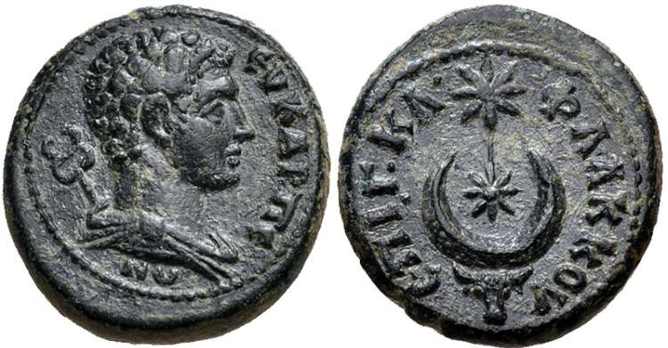 | BMC 9 | Phrygia, Eukarpeia, 15mm, 2.59 gr. EYKAΡΠEΩN; draped bust of Hermes right, caduceus behind / EΠI KΛ ΦΛAKKOY, small bucranium supporting crescent, one star within the crescent, another star above connected by a vertical line. BMC 9-10; SNG Cop 366, Weber 7087. | Text | Image |
