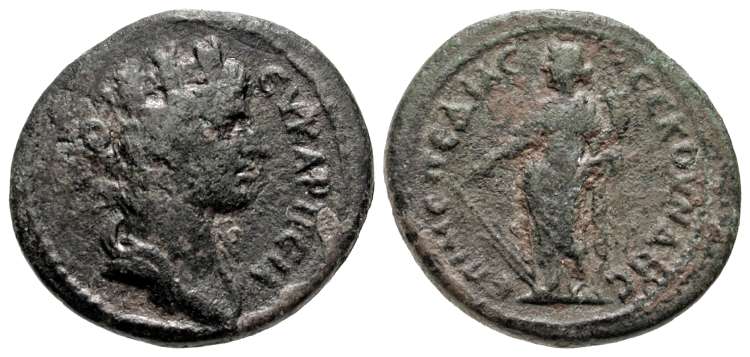 | Imhoof KM 2 | Septimius Severus, AE28 of Eucarpeia, Phrygia. 14.2 g. AD 193-211. AY K Λ CEΠT CEOYHΡOC, laureate, draped and cuirassed bust right. / EYKAΡΠEΩN, Tyche, turreted, seated left, holding corn-ears and sceptre. Imhoof KM 2. | Text | Image |