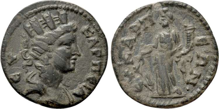 | Imhoof KM 4 | Plautilla, AE19 of Eucarpeia, Phrygia. AD 202-205. 4.2 g. ΦOYΛBIA ΠΛAYTIΛΛA, draped bust right. / EYKAΡΠEΩN, Tyche standing left, holding rudder and cornucopiae. Imhoof KM 4; Missere 298; Plankenhorn (Leu) 2004 (this coin). | Text | Image |