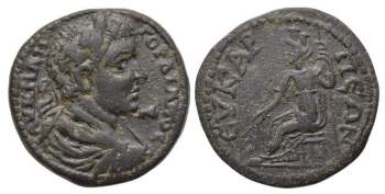 | BMC 18 | Geta AE23 of Eucarpeia, Phrygia. AD 198-209. ΠO CEΠTI ΓETAC KAI, bare-headed, draped and cuirassed bust right / EYKAΡΠEΩN, Artemis standing front, looking right, holding bow and drawing arrow from quiver; stag to left; small statue of Kybele to right. BMC 18-19; SNG Cop 371. | Text | Image |