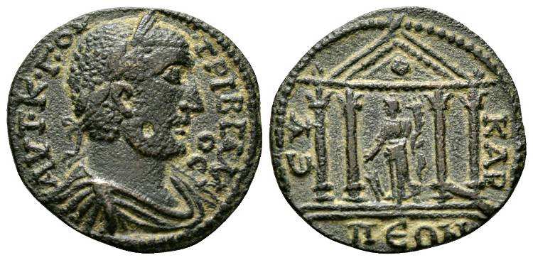 | Paris 1080 | Trebonianus Gallus AE25 of Eucarpeia, Phrygia. AD 251-253. 6.6 g. AYT K Γ IOY TΡIB ΓAΛΛOC, laureate, draped and cuirassed bust right. / EYKAΡΠEΩN, tetrastyle temple with Tyche standing left within, holding rudder and cornucopiae. Paris 1080; Waddington 6006; RPC IX, 808. | Text | Image |
