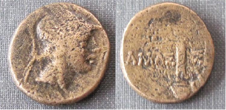SNG BM 1051 | Amaseia, Pontus, AE23, ca. 120 BC. Helmeted head of Ares right / AMAΣ-ΣE[IAΣ, sword in sheath. SNG Black Sea 1051; BMC 1; Rec. Gen. 3. | Text | Image |