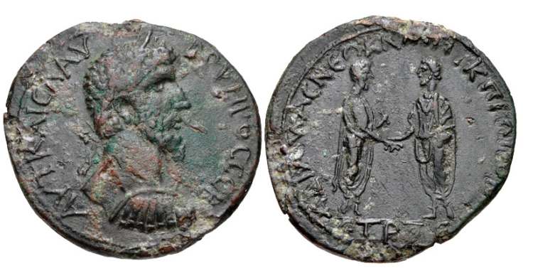 RecGen 51 | Septimius Severus, Amaseia, AE 30 of Amaseia, Pontus. AY KAI Λ CEΠ CEOYHΡOC, laureate, draped, cuirassed bust right / AΔΡ CEY ANT AMACIAC MHT NE ΠΡ, Caracalla and Geta both togate and with scrolls, facing each other and clasping hands. Date ET CH in ex. RecGen 51-52; Hunter 3; BMC 6. | Text | Image |