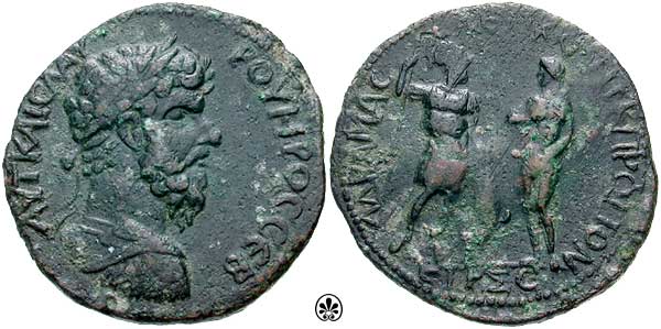 RecGen 69a var | Caracalla, AE29 of Amaseia, Pontos. Dated local year 209, AD 206-207. AY KAI M AY ANTΩNINOC, laureate, cuirassed bust right. / AΔΡ CEOY AN AMA(CI MH) NE ΠΡ ΠO, ET HΘ, Zeus-Serapis seated left, holding sceptre and extending hand over Kerberos at foot left. Var of RecGen 69a; SNG France 7, 989 and Grand Duc 893 (the date in rev field is incorrect, it should be CΘ and it should be in the right field.) | Text | Image |