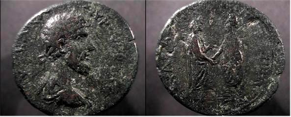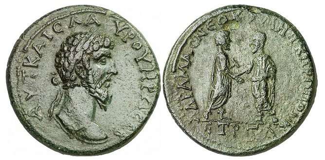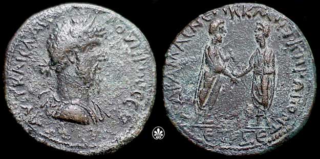 RecGen 28 var | Lucius Verus, AE of Amaseia, Pontus, 24.22 gr. Dated 164 AD. AYT KAIC Λ AYΡ OYHΡΩ CEB, laureate head right / AΔΡ AMAC NEΩK K MHT K ΠΡΩ ΠON below, Marcus Aurelius standing right, clasping hands with Lucius Verus, standing left, both holding scrolls. RecGen 28 var (obv. legend); Lindgren I 11 var (ditto). | Text | Image |