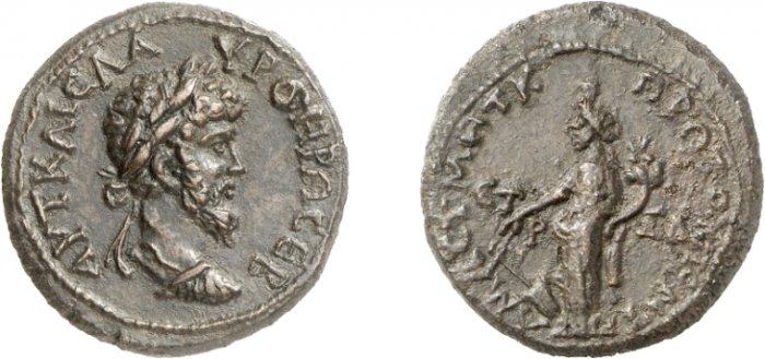 RecGen 65 | Caracalla AE 31mm of Amaseia, Pontus. Dated CY 208 (208/9 AD). AY KAI M AYΡ ANTΩNINOC, laureate, draped, and cuirassed bust right / AΔΡ CEV ANT AMACIAC MH NE ΠΡ Π, Tyche standing left, holding rudder and cornucopiae; date in right field. BMC 26v, SNGvA 6705. | Text | Image |