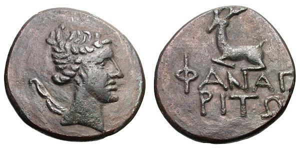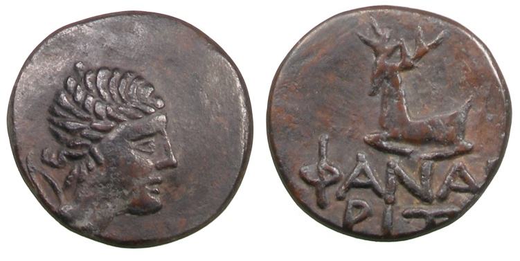| Anokhin 194 | Phanagoria, Pontos AE21 Tetrachalkon. ca 105-90 BC. Bust of Artemis right, draped, bow & quiver at shoulder / ΦANAΓO-ΡITΩN, forepart of stag reclining left. MacDonald 166/1. | Text | Image |
