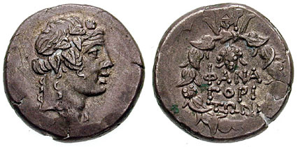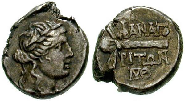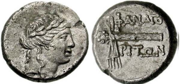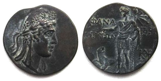 | SNG BMC 998 | Phanagoria, Pontos. Late 2nd-Mid 1st Century BC. AR Drachm. 3.81 g. Laureate bust of Apollo right / Thyrsos. ΓY&Theta. SNG BMC Black Sea 998; SNG Stancomb 626; SNG Cop 3; Anokhin 205. | Text | Image |