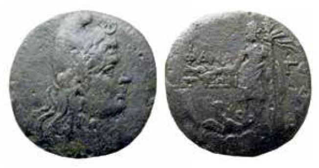 | RPC 1935 | Phanagoria as Agrippia, Pontos. AE8. 14-12 BC. Veiled and draped bust of Aphrodite (or Livia) right. / AΓΡIΠΠEΩN, prow left, H to right, two dots below. Macdonald 275; RPC 1935; SNG Stancomb 631. | Text | Image |