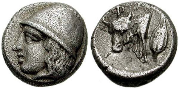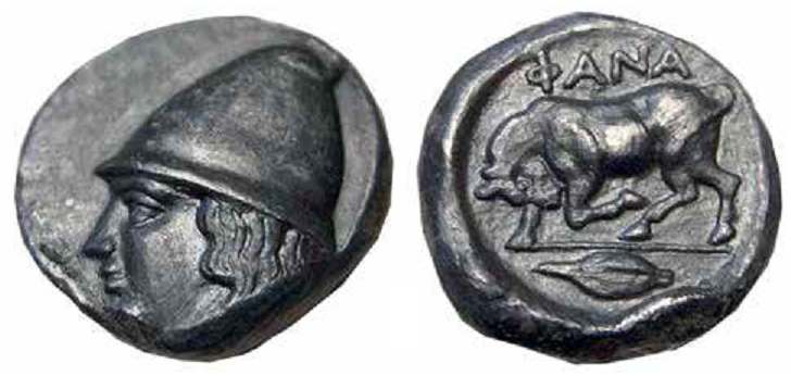 | BMC 1 | Phanagoria, Pontos. AR drachm. 390 BC. Youthful head of Kabeiros left, wearing conical cap. / ΦANA above bull butting left, barley corn below. BMC 1; BMC Black Sea 987-989; Traité II-4 1761; Anokhin 77. | Text | Image |