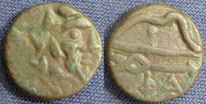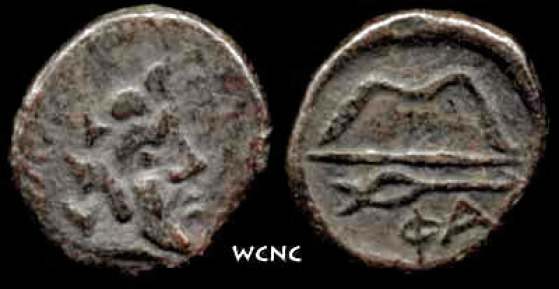| BMC 3 | Phanagoria, Pontos. AE11. Late 4th-3rd cent. BC. Head of Pan or satyr right. / ΦA beneath bow and arrow. BMC 3; BMC Black Sea 990-993; Traité II-4, 1765; MacDonald 157; Sear SG 3615. | Text | Image |