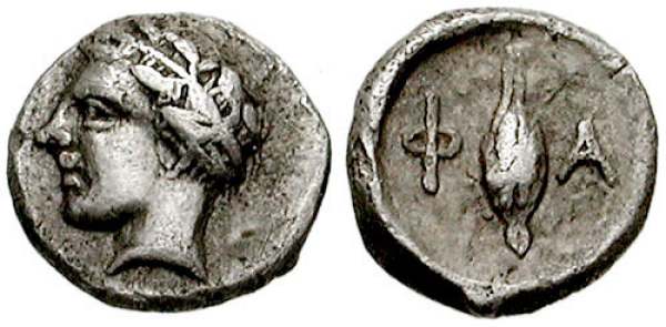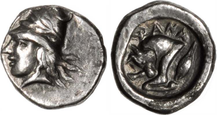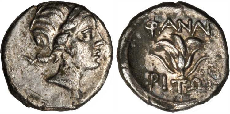 | SNG BM 989 | Phanagoria, Pontus, AR Tetartemorion. 4th century BC. 0.28 g. Male head left wearing pileus. / Φ-A to left and right of barley corn. SNG BM Black Sea 989; Anokhin 79. | Text | Image |