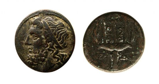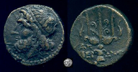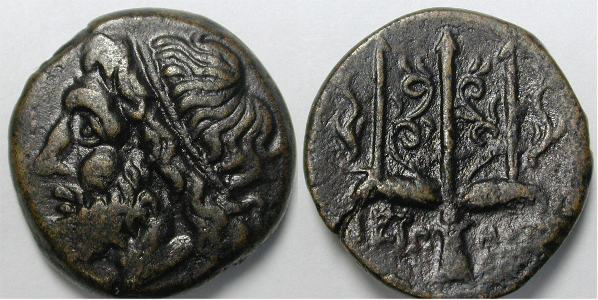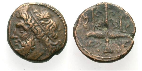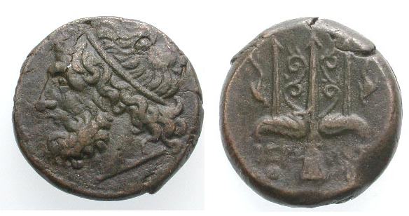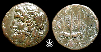 | BMC 606v | Syracuse, Sicily AE20. Diademed head of Poseidon left / trident, AM IEΡΩNOΣ below. | Text | Image |