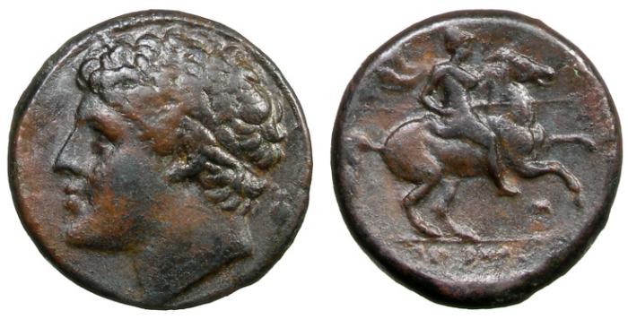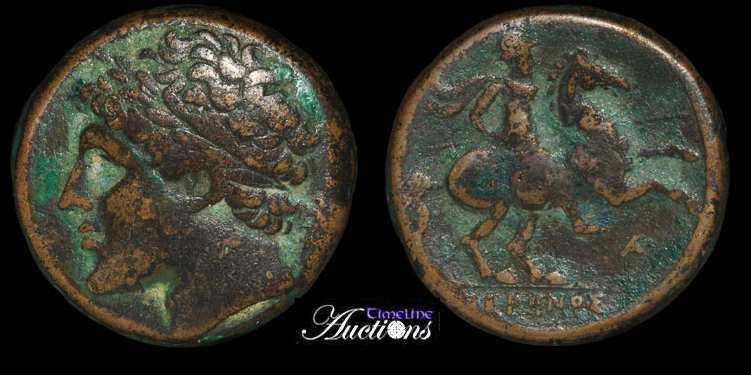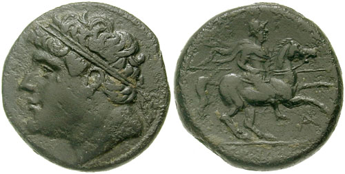 | Calciati 195 | Syracuse, Sicily, Hieron II AE 27mm. Diademed head of Hieron left / Horseman galloping right, holding lance; N or other letter(s) at lower right. SNG ANS 924; BMC 588. | Text | Image | Text | Image |