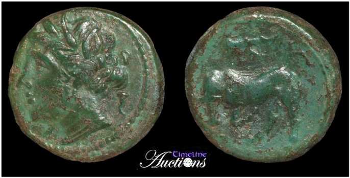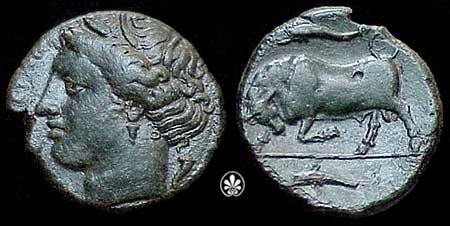 | Calciati 192 | Syracuse, Sicily, Hieron II AE20. Head of Persephone left / Bull butting left; above, club; below, IE. | Text | Image |
