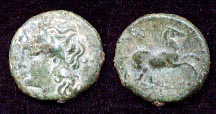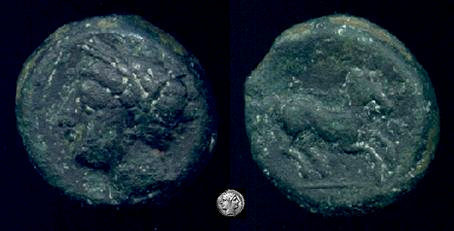 | BMC 635 | Syracuse, Sicily AE17. Time of Hieron II, 275-215 BC. Head of Apollo(?) left / free horse prancing right. SNG Cop 859. | Text | Image | Text | Image |