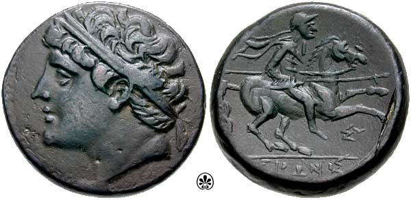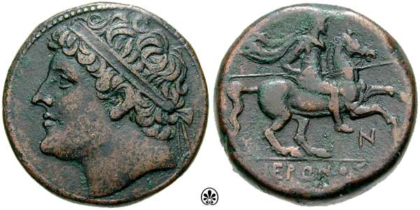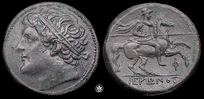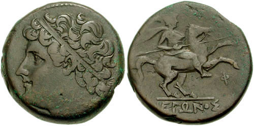 | SNG ANS 919cf | Syracuse, Sicily, Hieron II AE27. Diademed head left / IEΡΩNOΣ, mounted horseman holding spear galloping right, symbol in field right. | Text | Image |
