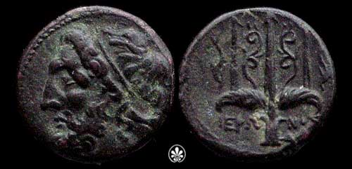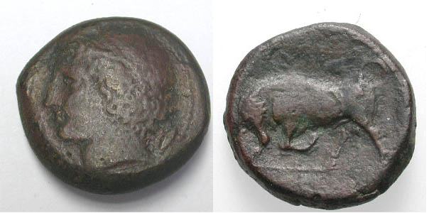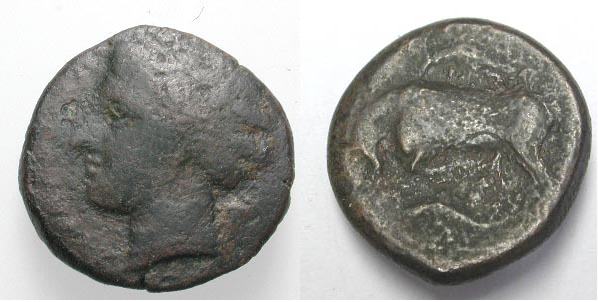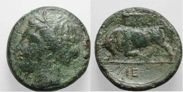 | Calciati 192 | Syracuse, Sicily, Hieron II AE20, 5.67 gr. ΣYΡAKOΣIΩN, Head of Persephone left / Bull butting left; above, club over M; IE below. Calciati 192; Hoover 1469. | Text | Image |
